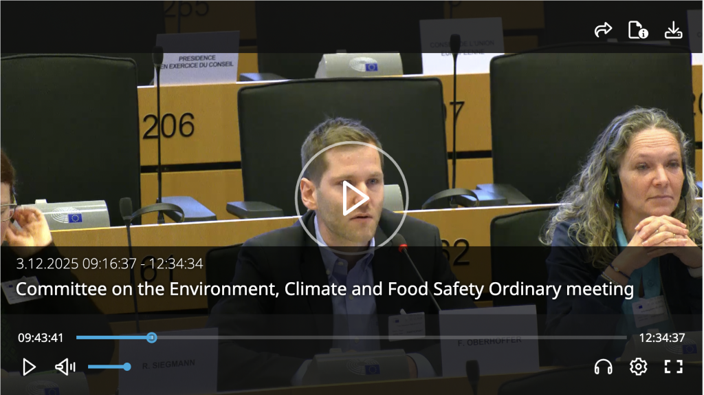 Simultaneous interpreting from German into English at the European Parliament. ENVI committee hearing on The health risks of energy drinks – December 2025 (from 09.43.30 ).