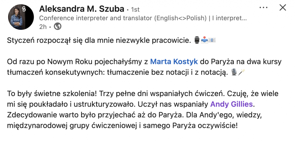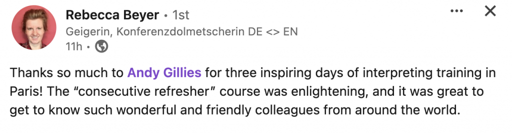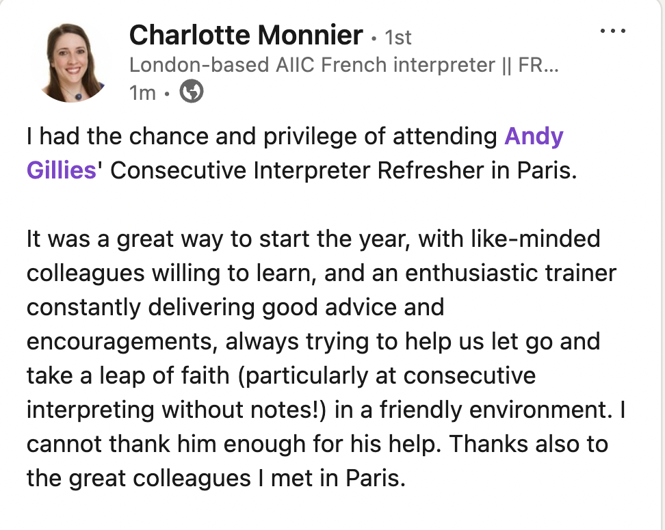 He is author of 3 books: Consecutive Interpreting; Note-taking for Consecutive Interpreting; and Conference Interpreting – A student’s practice book . He has also translated J-F. Rozan’s La Prise de Notes dans l’interprétation consécutive into English. Andy curates both the Interpreter Training Resources and the Interpreters CPD websites.